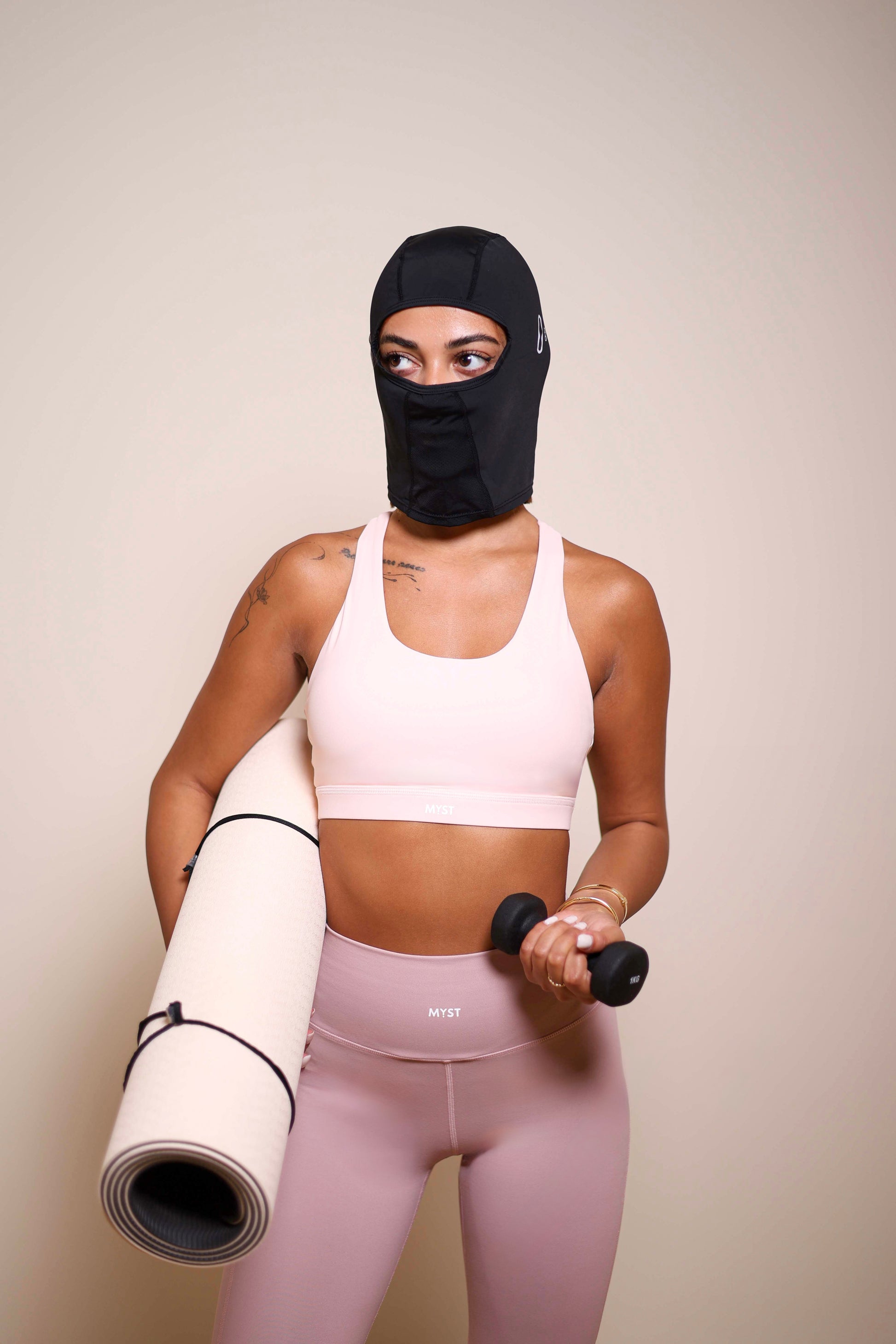 This light pink sports bra offers medium-impact support with moisture-wicking fabric and adjustable straps. Its soft sheen embodies Myst’s elegance.